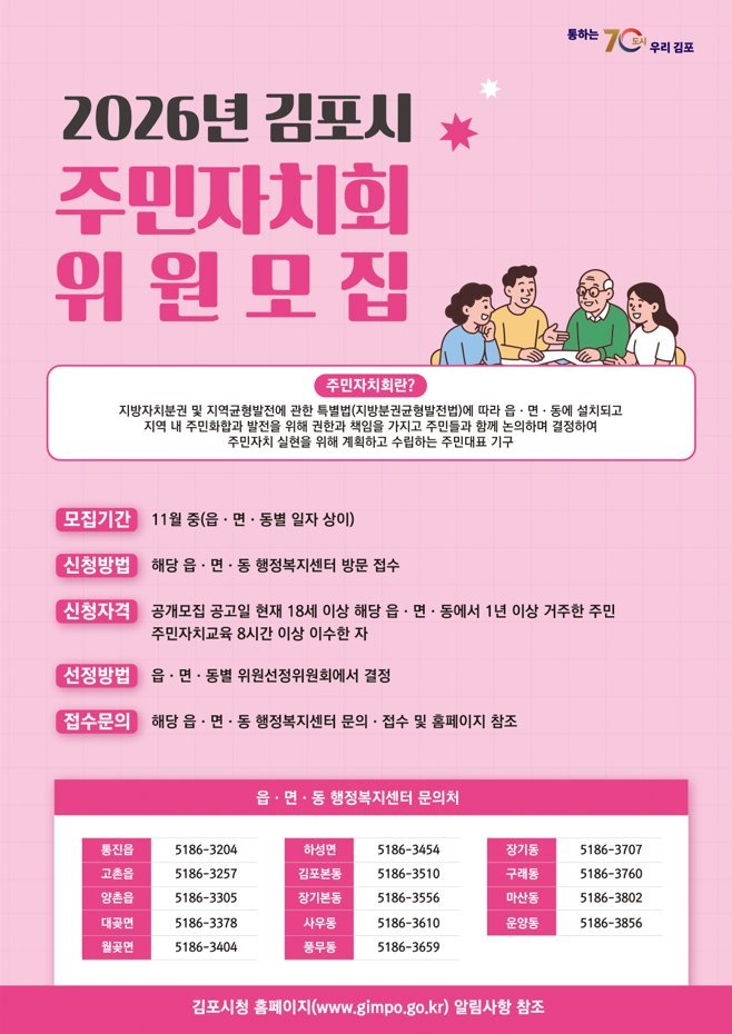 [금요저널] 김포시는 2025년 주민자치회 3기 임기 종료를 앞두고 ‘주민이 만드는 실질적 주민자치’를 실현하기 위한 4기 주민자치회 위원을 공개모집한다고 밝혔다.