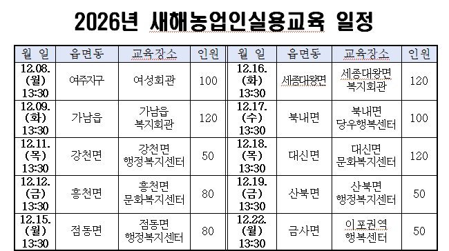[금요저널] 여주시는 오는 2025년 12월 8일부터 12월 22일까지 총 10회에 걸쳐 진행하는 ‘2026년 새해농업인실용교육’을 추진한다고 밝혔다.