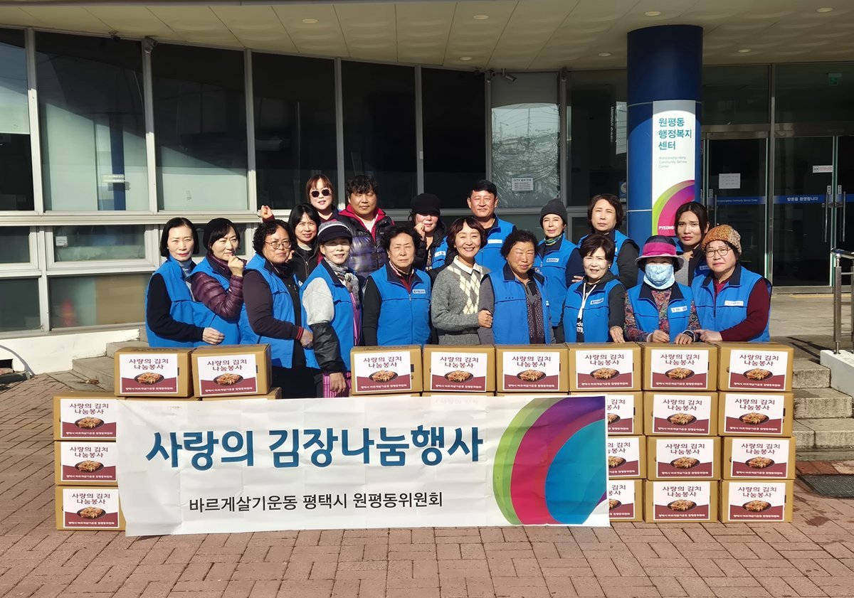 김재신 원평동장은 “쌀쌀한 날씨에도 불구하고 바르게살기운동 평택시 원평동위원회 회원들이 힘을 모아 김장 나눔 행사를 진행해 주신 데 깊이 감사드린다”며 “이번 행사가 관내 어려운 이웃들이 따뜻한 겨울을 보내는 데 작은 힘이 되길 바란다”고 전했다.