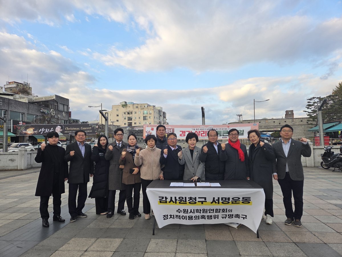 국민의힘 의원단은 이번 사안의 핵심을 “수원시가 성과보고회라는 명복으로 용역 계약의 형태로 수원시학원연합회 회원들만 혜택을 주는 방식으로 진행해 온 구조와, 해당 단체의 민주당 집단 당원모집 정황이 동시에 제기된 만큼, 두 사안의 관련성 여부를 감사 절차를 통해 명확히 확인해야 한다고 밝혔다.”의원단은 이 문제를 단순한 예산 집행 오류가 아니라, 행정지원–단체활동–정치활동 이해관계가 연속적으로 얽힌 중대한 사안이라고 강조했다.