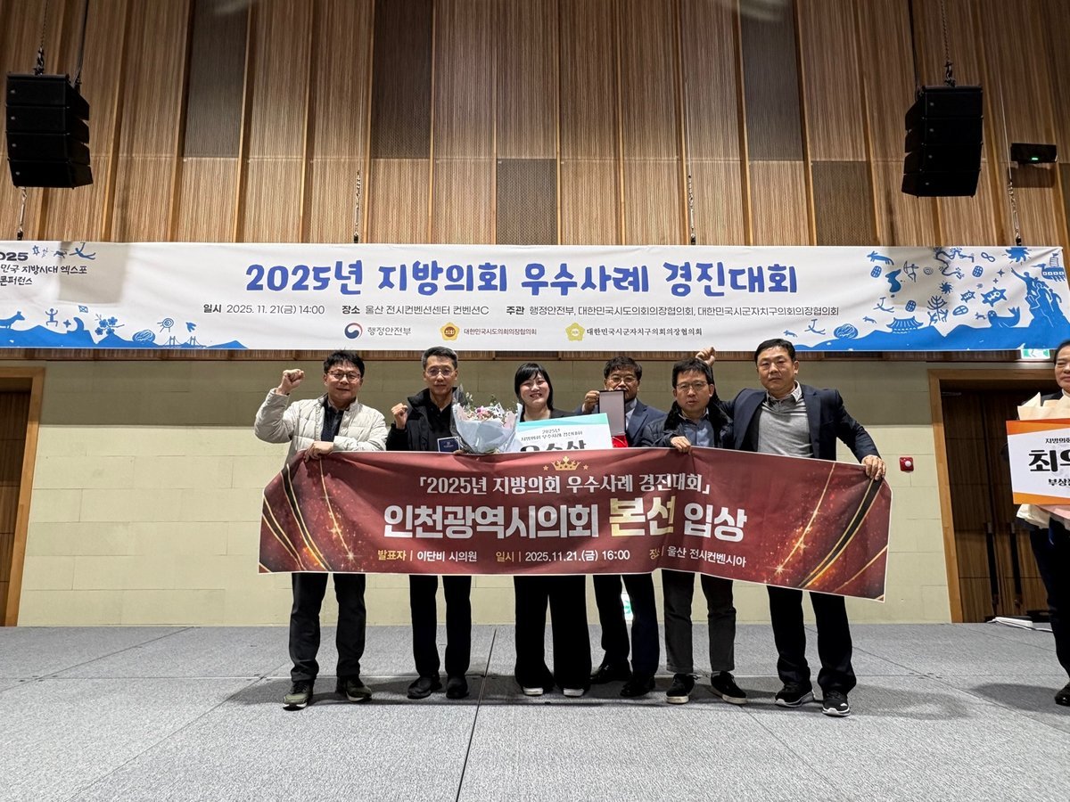 [금요저널] 인천광역시의회가 최근 울산시 전시컨벤션센터에서 열린 행정안전부 주관 ‘2025년 지방의회 우수사례 경진대회’에서 우수상을 수상했다고 24일 밝혔다.