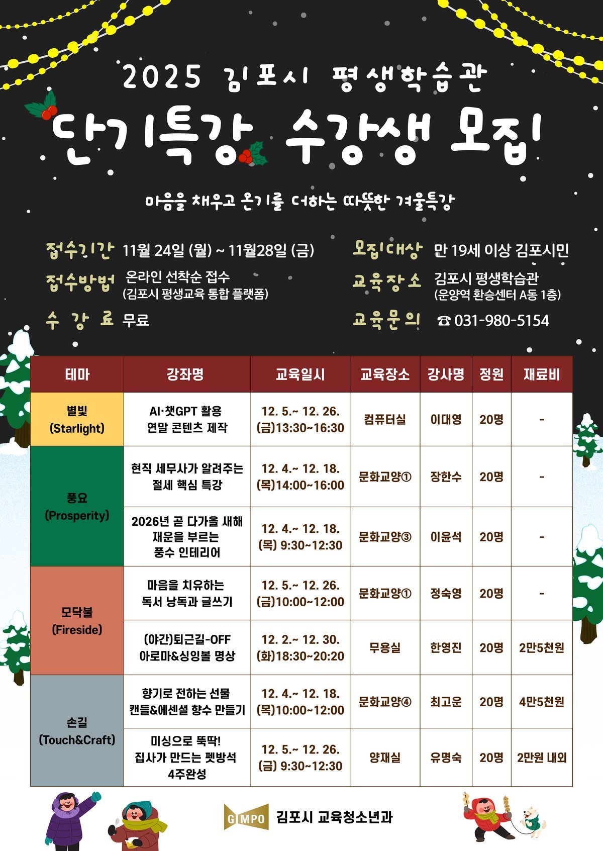 [금요저널] 김포시는 ‘따뜻한 연말’을 주제로 시민의 정서적 힐링과 실생활에 유용한 학습 기회 제공을 위해, ‘2025년 하반기 평생학습관 단기특강 수강생’을 오는 11월 24일부터 선착순으로 모집한다.