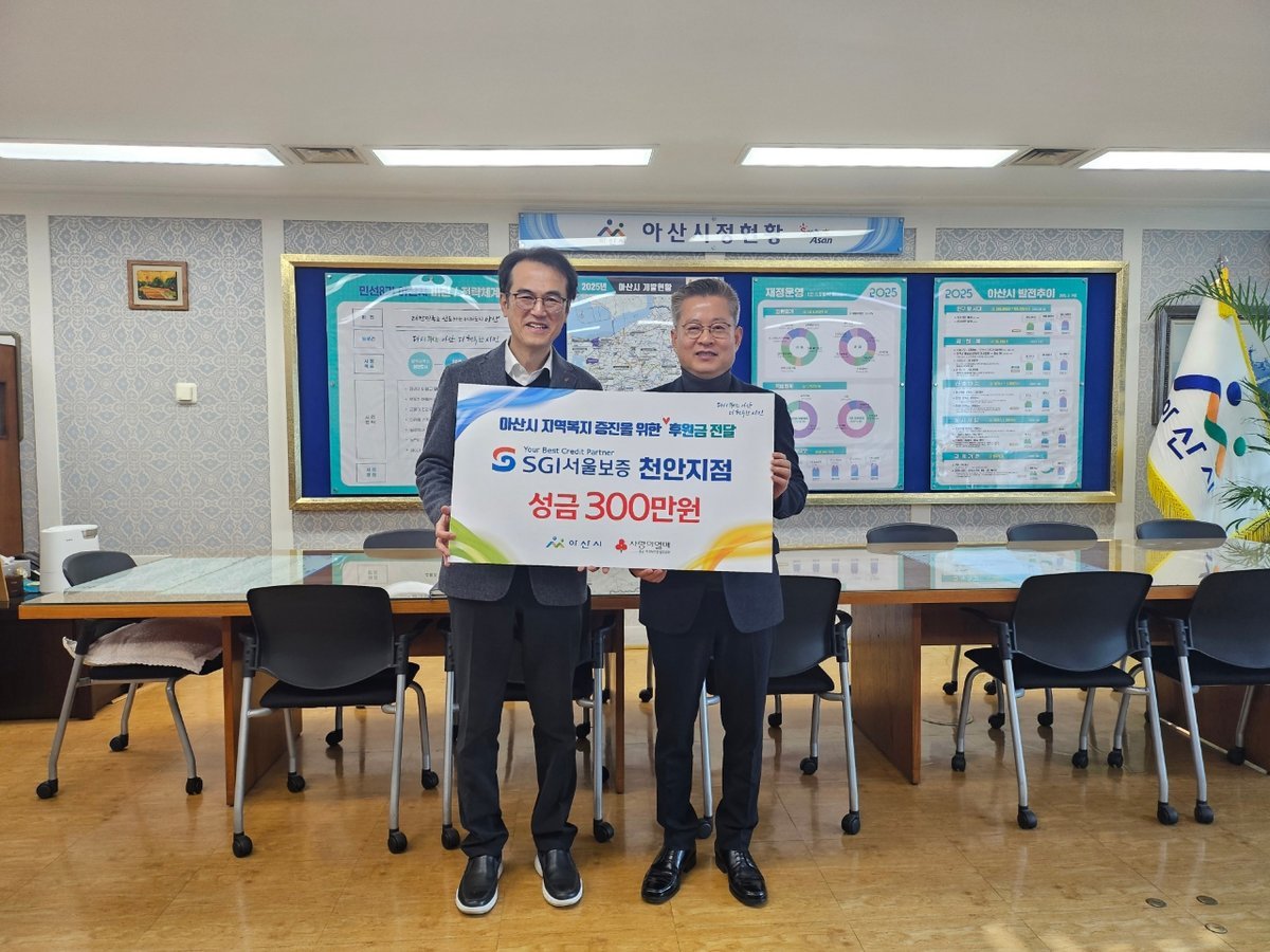 [금요저널] 아산시는 SGI서울보증 천안지점이 24일 지역사회 사회복지시설 지원을 위한 성금 300만 원을 전달했다고 밝혔다.