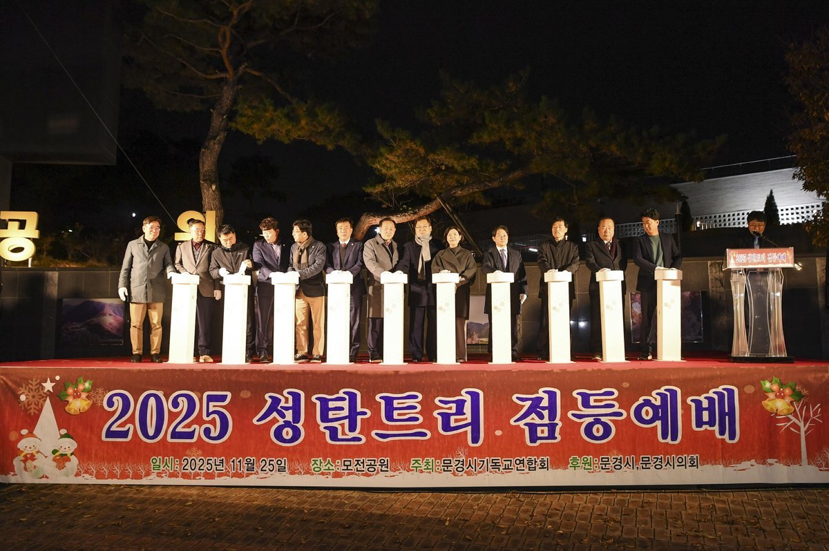 [금요저널] 문경시는 지난 25일 성탄을 맞이하여 성탄 트리를 설치하고 문경시기독교연합회 주관으로 모전공원 광장에서 관내 기독교 신도 및 시민 등 200여 명이 참석한 가운데 ‘2025년 시민화합 성탄트리 점등식’을 했다.