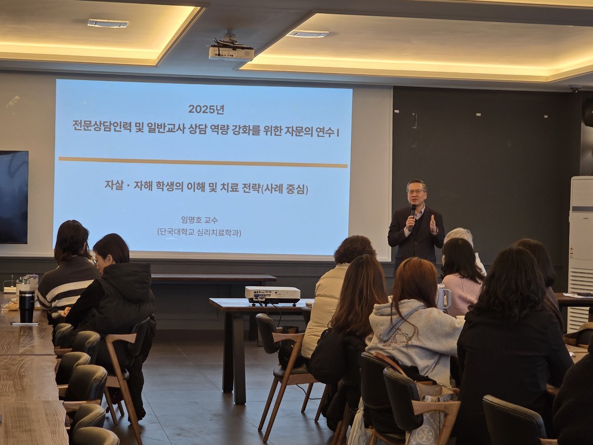 오전 연수 : “자살·자해 학생 이해 및 치료 전략 ”오전 강의에서 임명호 교수 는 위기 청소년의 심리사회적 요인 을 분석하며, 이러한 요인이 자살 행동에 미치는 영향을 설명했다.