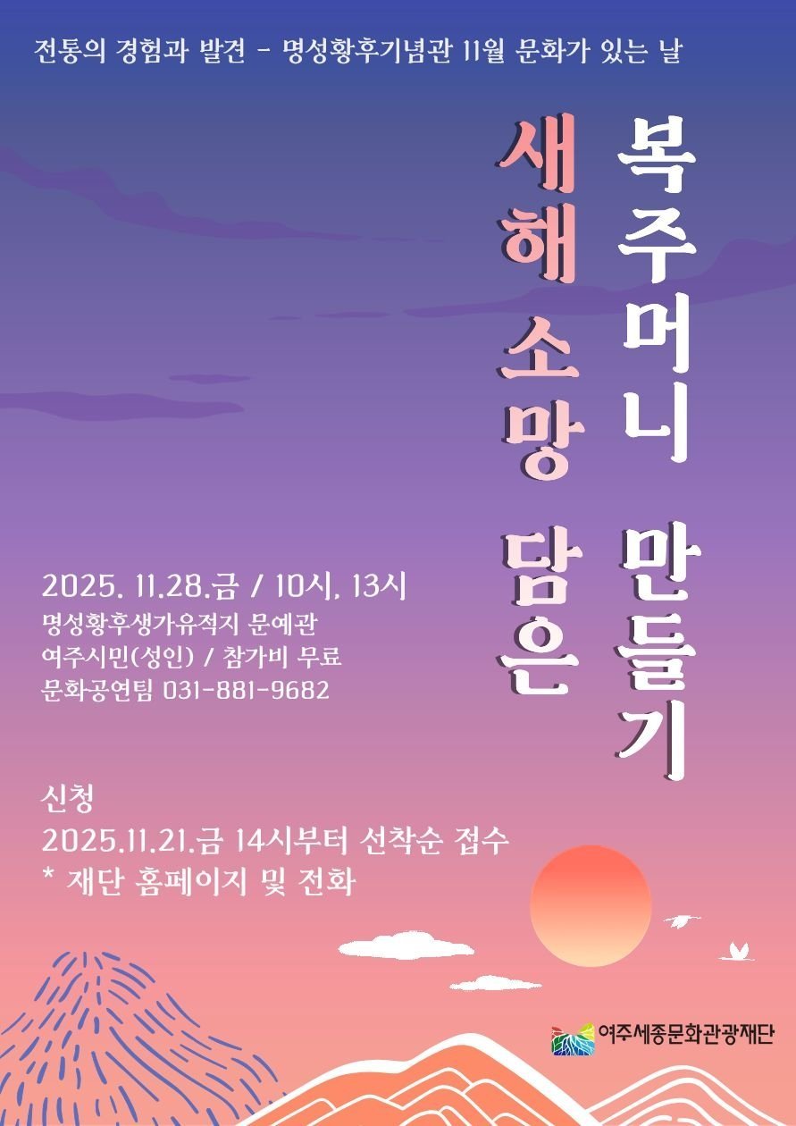[금요저널] 여주세종문화관광재단은 오는 11월 28일, 명성황후기념관 11월 문화가 있는 날 프로그램으로‘새해 소망 담은 복주머니 만들기’를 진행한다.