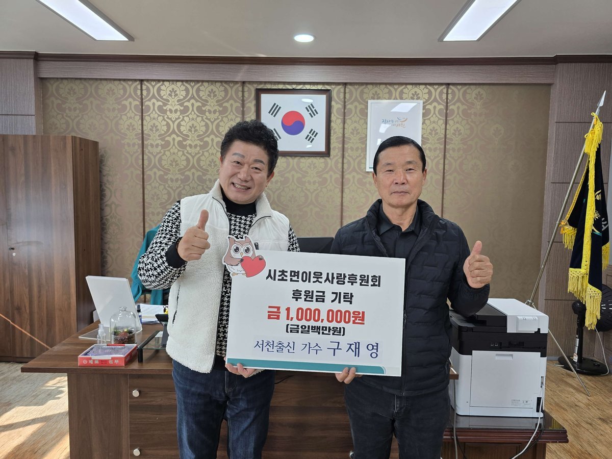 [금요저널] 서천군 시초면 출신 가수 구재영 씨가 지역의 취약계층을 돕기 위해 시초면이웃사랑후원회에 후원금 100만원을 기탁했다.