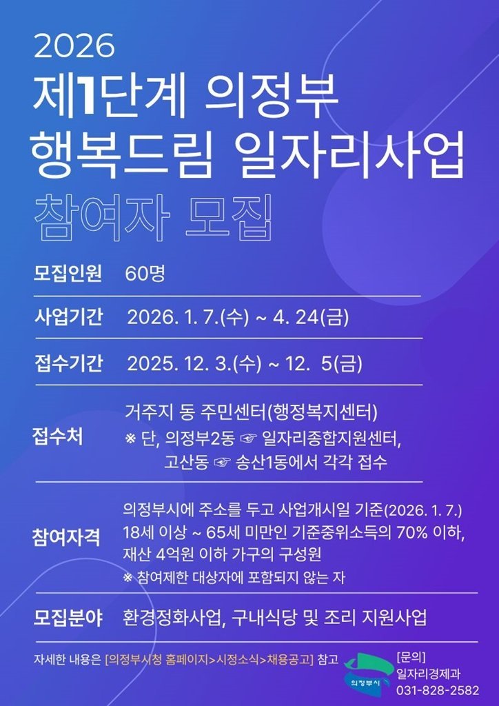 [금요저널] 의정부시는 12월 3일부터 5일까지 ‘2026년 제1단계 의정부 행복드림 일자리사업’ 참여자 60명을 모집한다.
