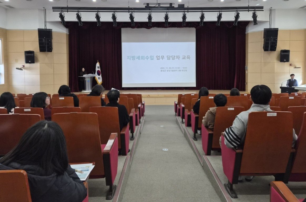 [금요저널] 홍성군은 세외수입 실무자의 업무 역량을 강화하고 효율적인 행정 처리를 위해 지난 26일 홍성군 농업기술센터 대강당에서 ‘세외수입 업무 담당자 교육’을 실시했다. 이번 교육에는 홍성군 본청 및 읍·면사무소의 세외수입 담당 공무원 50여 명이 참석했다.