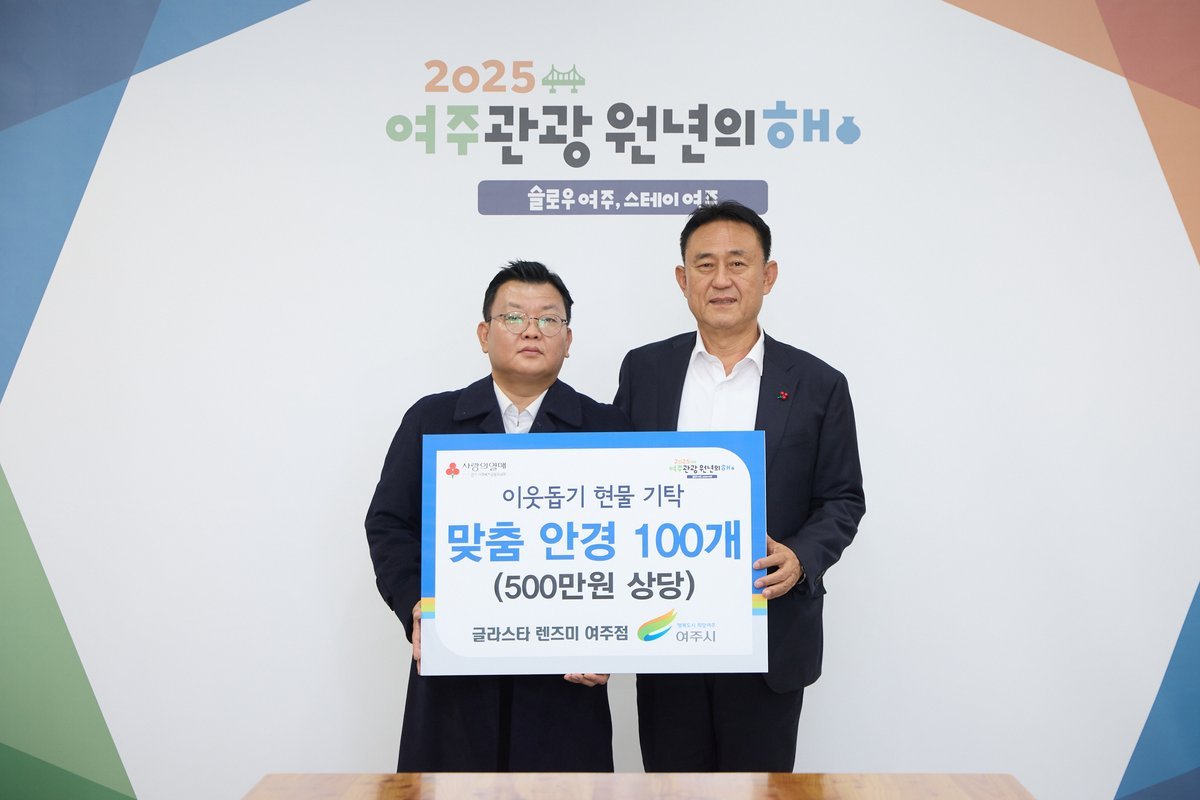 이충우 여주시장은 “어려운 가운데서도 후원해 주신 석광주 대표님께 감사드리며 특히, 다른 후원품과 달리 안경은 물건만 후원 하는게 아니라 검사 및 제작 등 많은 시간과 노력 봉사도 함께 제공되어야 하는 만큼 기부의 의미가 더 큰 것 같다.”며 감사의 마음을 전하였다.