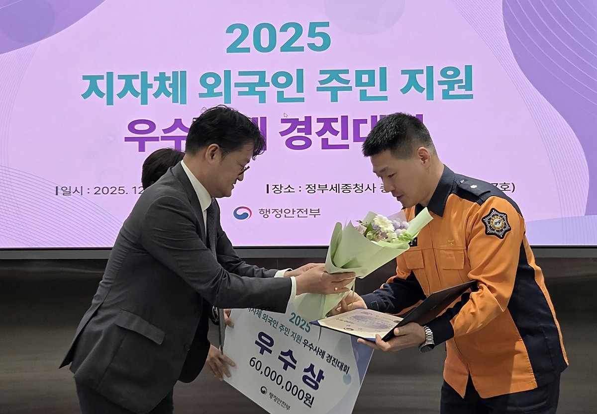 [금요저널] 대전동부소방서는 1일 정부세종청사에서 열린 「2025년 지자체 외국인주민 지원 우수사례 경진대회」에서 대전시 대표로 출전한 ‘외국인 주민과 함께하는 119안전라이프+’가 행정안전부 장관상인 우수상을 수상했다.