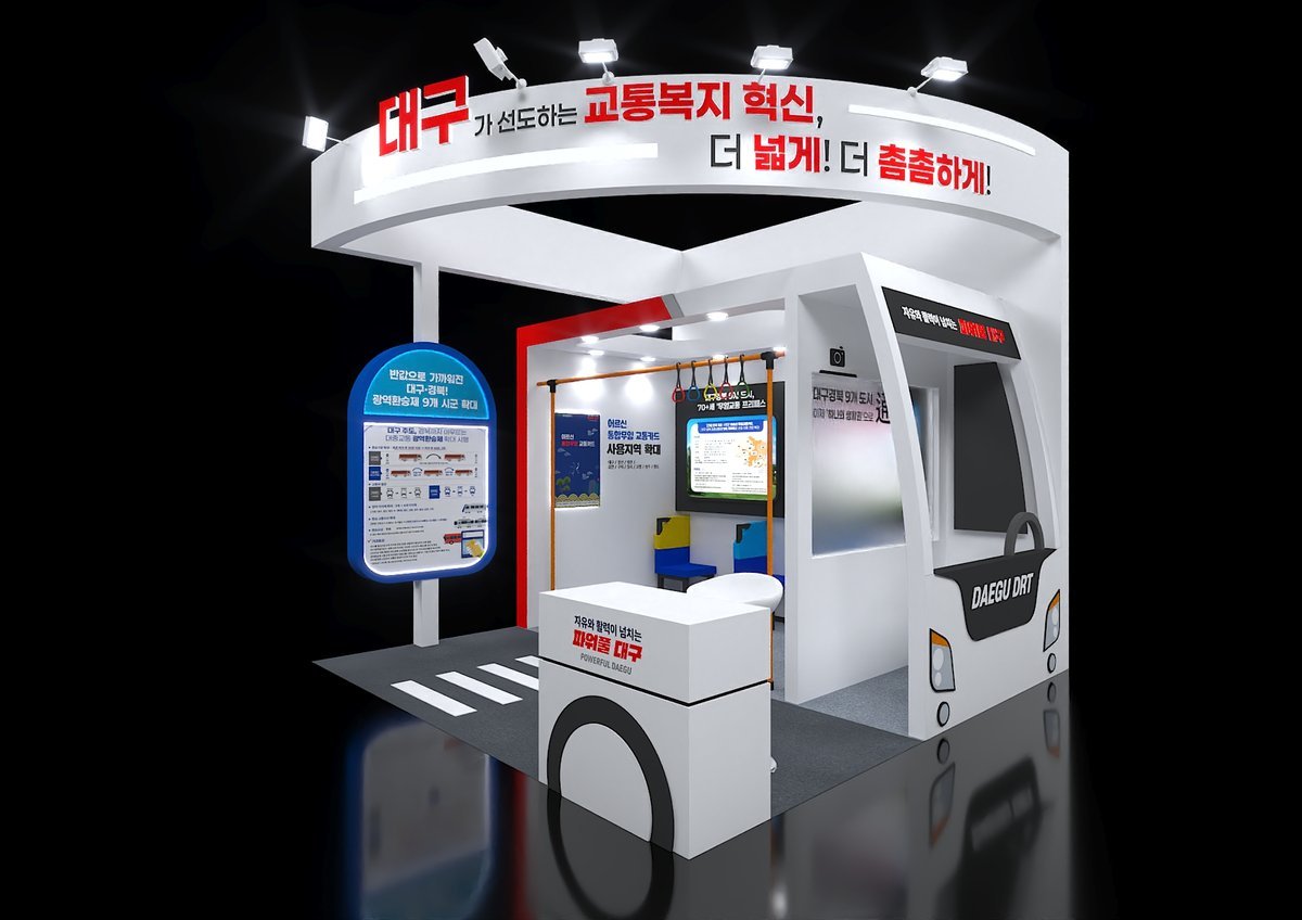 대구와 경북 8개 지자체 연결, 대중교통 요금 50% 절감 효과 70세 이상 어르신, 대구와 경북 8개 지자체서 대중교통카드 무임 사용 대중교통 취약지역인 북구 연암서당골, 수성구 범물동에 DRT 확대전시관은 실제 버스 내부를 축소 구현한 모형 부스로 꾸며지며, 대형 모형 카드, 정책 안내 패널, 간단한 퀴즈 이벤트존 등 다양한 체험형 콘텐츠를 통해 관람객들이 대구시 교통복지 혁신을 쉽고 재밌게 이해할 수 있도록 구성된다.