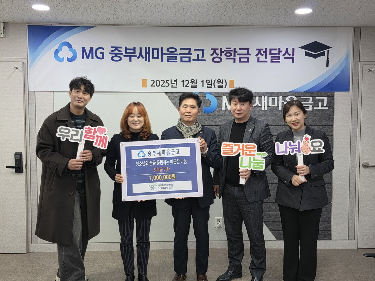 [금요저널] 남양주시는 지난 1일 중부새마을금고가 남양주시 남부희망케어센터에 지역 청소년을 위한 장학금 700만 원을 후원했다고 밝혔다.