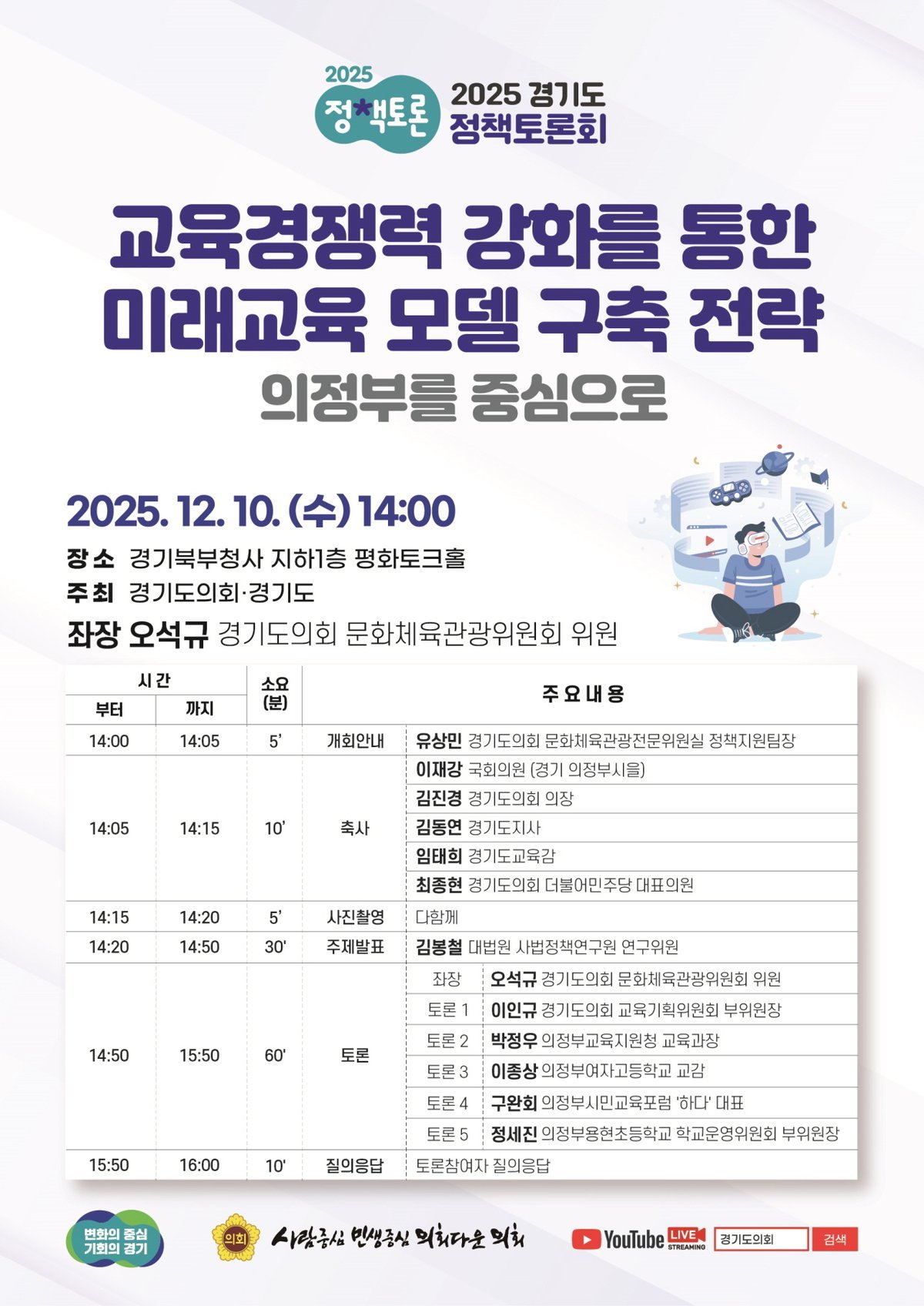 [금요저널] 경기도의회 문화체육관광위원회 오석규 의원은 오는 10일 의정부시의 교육경쟁력을 높이고 지역 인재 유출을 방지하기 위한 ‘교육경쟁력 강화를 통한 의정부형 미래교육모델 구축 전략 정책토론회’를 개최한다.