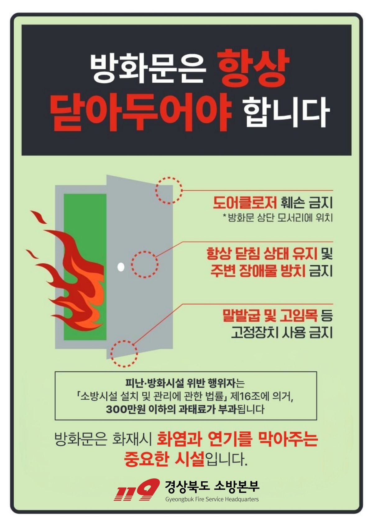 한창완 경산소방서장은 “방화문은 평소에는 잘 느껴지지 않지만, 화재 발생 시 생사를 가르는 중요한 안전장치”라며 “시민 한 분의 작은 실천이 인명피해를 막는 가장 효과적인 방법인 만큼 일상 속에서 방화문이 항상 닫혀 있도록 적극 동참해 달라”고 당부했다.