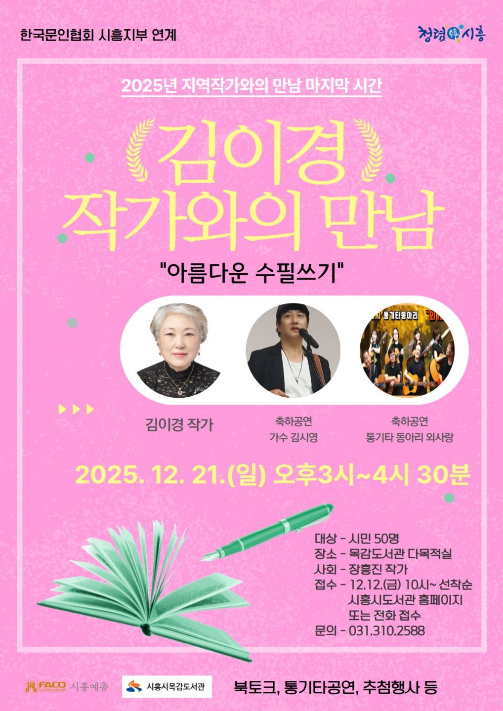 목감도서관 관계자는 “최근 글쓰기에 관심을 기울이는 시민이 늘고 있는 만큼, 지역작가를 직접 만나 생각을 나누고 글쓰기 감각을 키울 소중한 기회가 될 것”이라며 “올해 마지막으로 진행되는 지역작가와의 만남을 통해 시민들이 수필의 아름다움과 글쓰기의 즐거움을 새롭게 발견하고 풍족한 연말이 되시길 기대한다”라고 말했다.