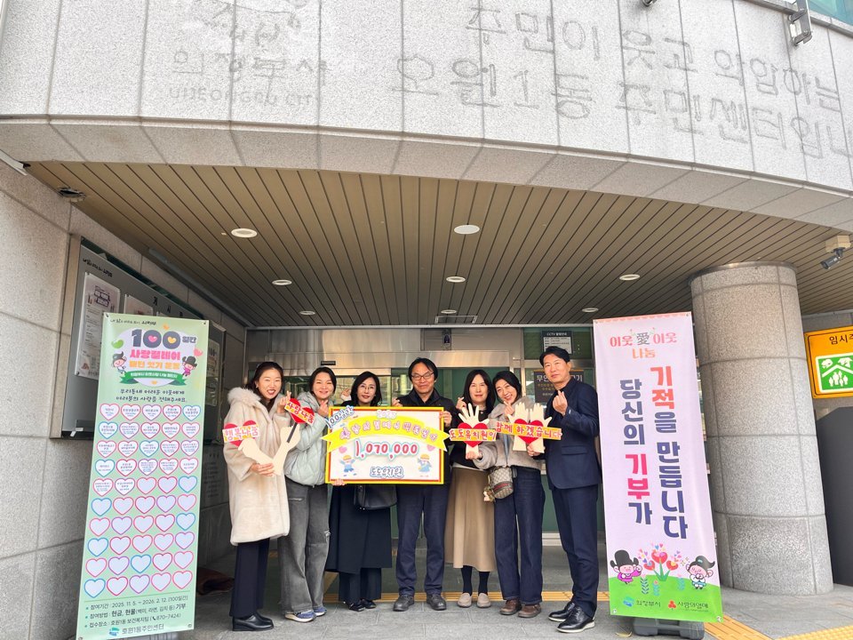 [금요저널] 의정부시 호원1동주민센터는 12월 2일 도도유치원이 자선기부행사를 통해 모금한 수익금 107만 원을 전달하며 ‘100일간 사랑릴레이 배턴 잇기’에 동참했다고 밝혔다.