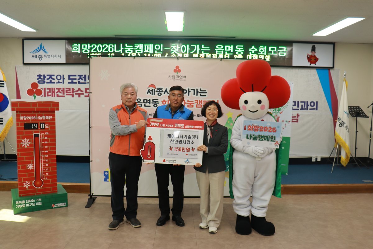 [금요저널] 세종특별자치시 소정면이 지난 4일 열린 ‘2026년 희망나눔 캠페인 찾아가는 읍면동 순회모금’ 행사에서 케이워터기술㈜천안권사업소가 150만 원을 기부했다고 밝혔다.