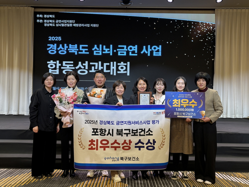 포항시 북구보건소는 지난 5일 경상북도가 주관하는 ‘2025년 심뇌·금연사업 합동 성과대회’에서 금연지원서비스사업 부문 최우수기관으로 선정됐다.