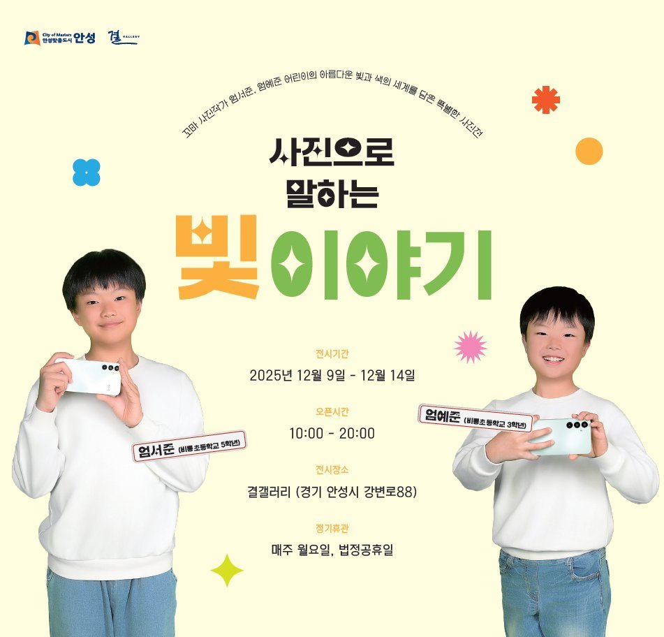 [금요저널] 안성천 우리동네 작은미술관 결갤러리는 12월 9일부터 12월 14일까지 두 어린이 사진작가 엄서준, 엄예준의 특별한 전시 ‘사진으로 말하는 빛 이야기’를 개최한다.