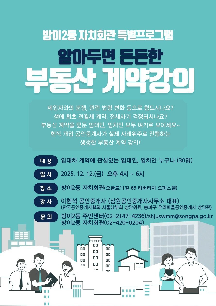 [금요저널] 서울 송파구는 방이2동 자치회관에서 오는 12월 12일 오후 4시부터 6시까지 '알아두면 든든한 부동산 임대차 계약 강의'를 개최한다.