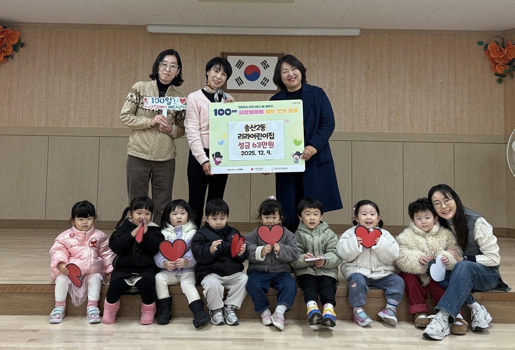 [금요저널] 의정부시 송산2동주민센터는 12월 9일 민락동 소재 리라어린이집이 ‘100일간 사랑릴레이 배턴 잇기’에 동참해 성금 63만 원을 기탁했다고 밝혔다.