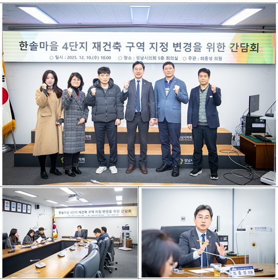 [금요저널] 성남시의회 더불어민주당 최종성 의원은 12월 10일 성남시의회 5층 회의실에서 ‘한솔마을 4단지 재건축 구역 지정 변경 간담회’를 개최했다고 밝혔다.