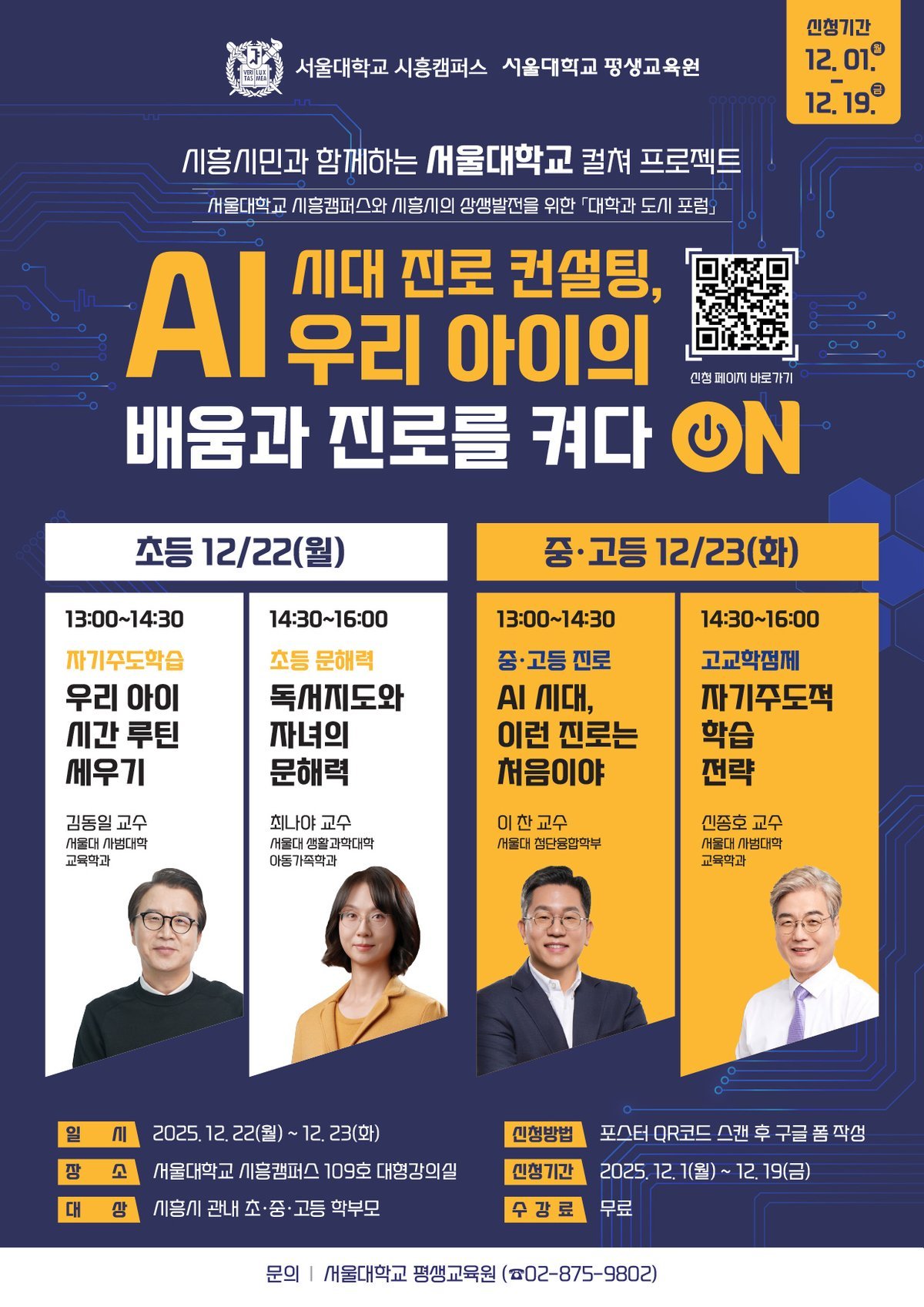 이번 프로그램은 시민 수요가 높은 학습ㆍ진로 분야를 우선으로 다루며, 서울대 교수진이 직접 강연자로 참여해 인공지능 시대에 필요한 진로 컨설팅 정보를 전달한다. 강연을 맡은 교수들은 학습 심리ㆍ문해력ㆍ교육 분야에서 폭넓은 연구 경험을 보유한 서울대 교수진으로, 전문적이고 신뢰도 높은 내용을 전달할 예정이다.
