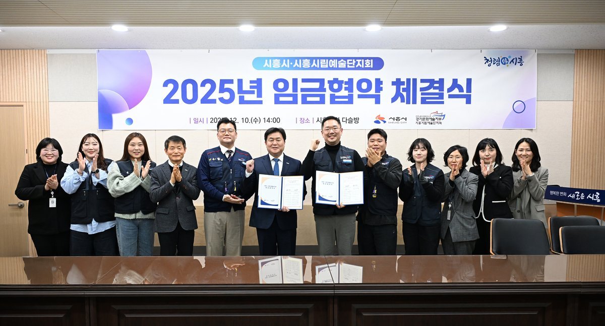 [금요저널] 시흥시가 시립예술단 노조와 예술단원 처우 개선을 담은 ‘2025년 임금협약’을 체결했다. 시는 12월 10일 시청 다슬방에서 전국공공운수사회서비스노동조합 경기문화예술지부 시흥시립예술단지회와 임금 협약식을 진행했다.