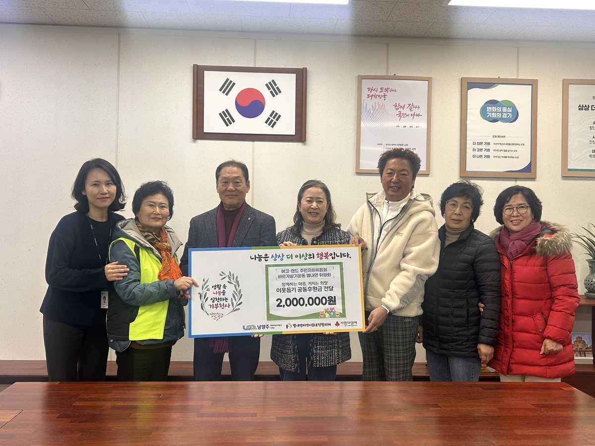 [금요저널] 남양주시는 지난 10일 연말을 맞아 에코-랜드 주민지원협의체와 바르게살기운동 별내면위원회가 별내면 취약 가구 지원을 위한 공동 후원금 200만 원을 경기사회복지공동모금회를 통해 별내면 지역사회보장협의체에 기탁했다고 밝혔다.