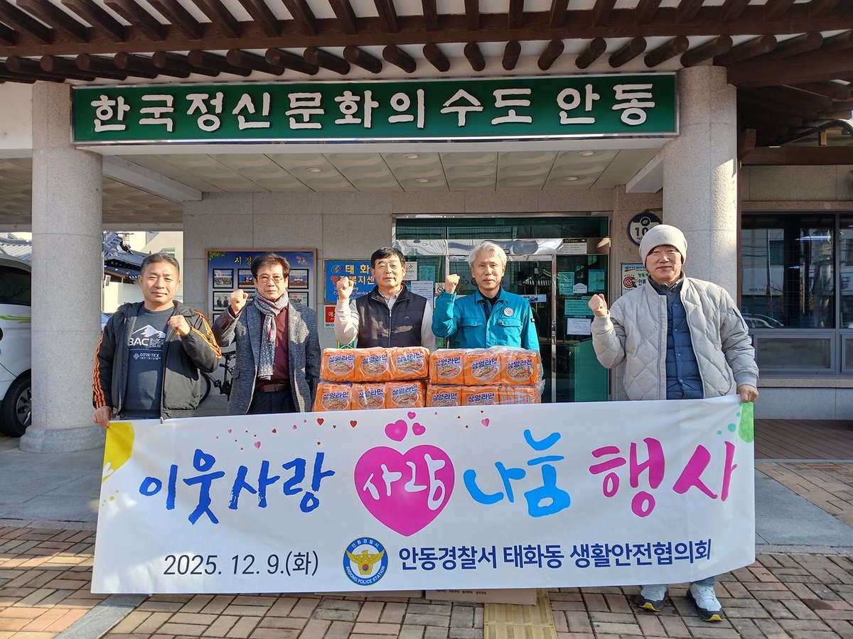 [금요저널] 안동경찰서 태화동 생활안전협의회은 12월 10일 태화동 행정복지센터를 방문해 태화동 경로당 어르신들께 전달할 라면을 기탁하며, 올해 두 번째 라면 나눔을 실천했다.