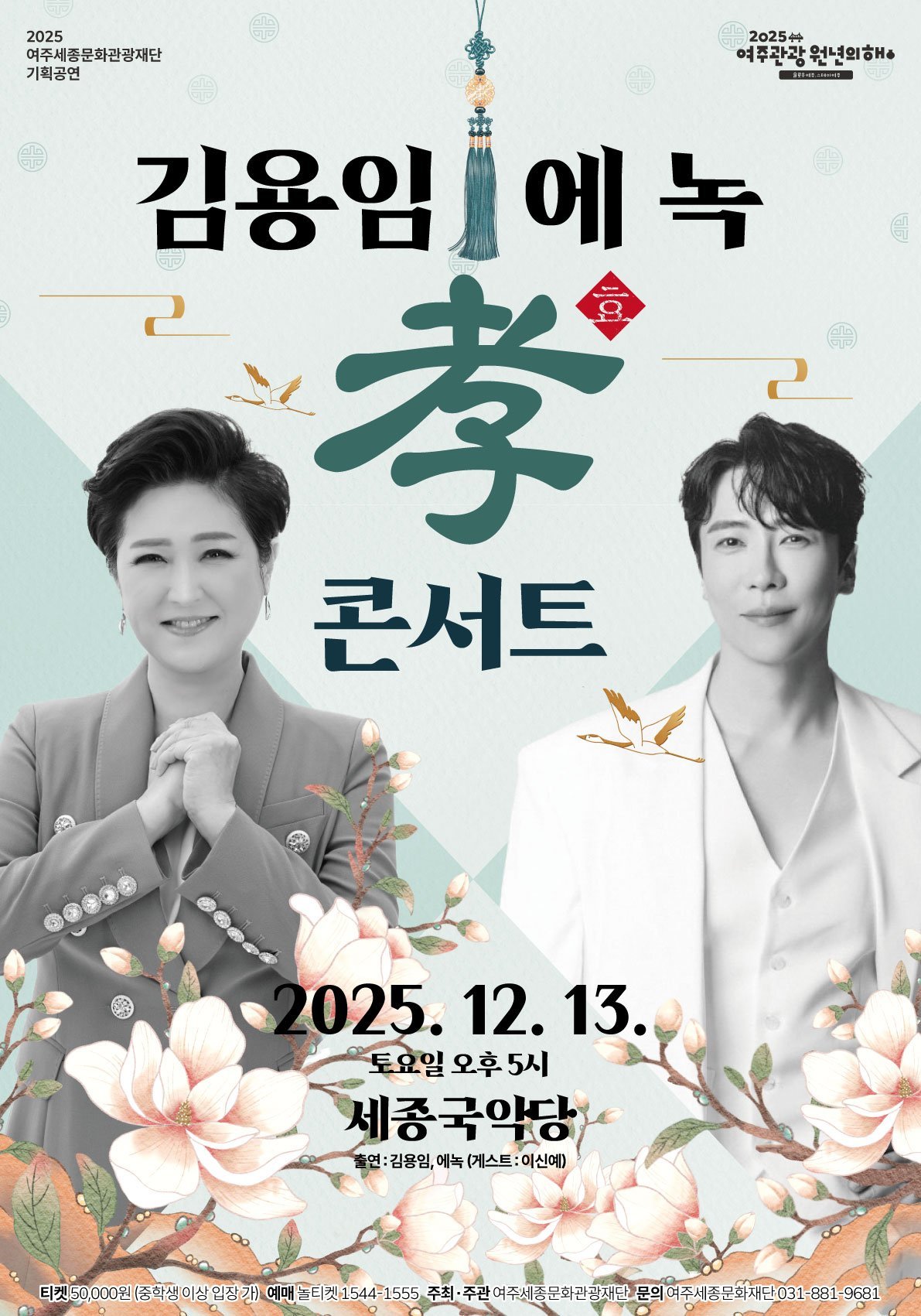 공연 개요 공연명김용임 & 에녹의 효 음악회일시2025년 12월 13일 오후 5시장소세종국악당입장가능연령8세 이상티켓 가격여주시민 특별가 3만5000원주최·주관여주세종문화관광재단문의여주세종문화관광재단 공연 이미지