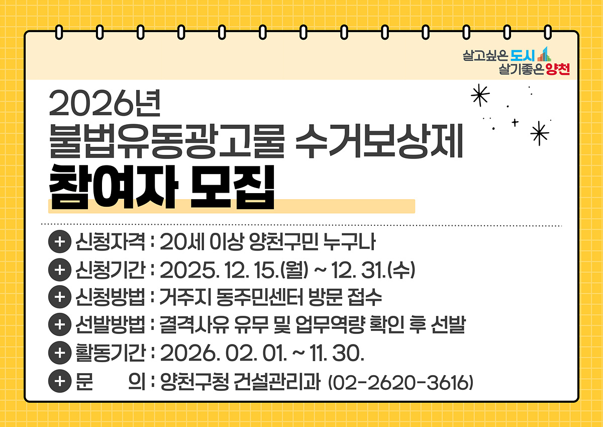 양천구(구청장 이기재)는 도시 미관을 해치고 보행 안전을 위협하는 불법 현수막·전단 등을 집중 정비하기 위해 ‘2026년 불법유동광고물 수거보상제’를 운영하고, 오는 31일까지 참여자를 모집한다고 14일 밝혔다.