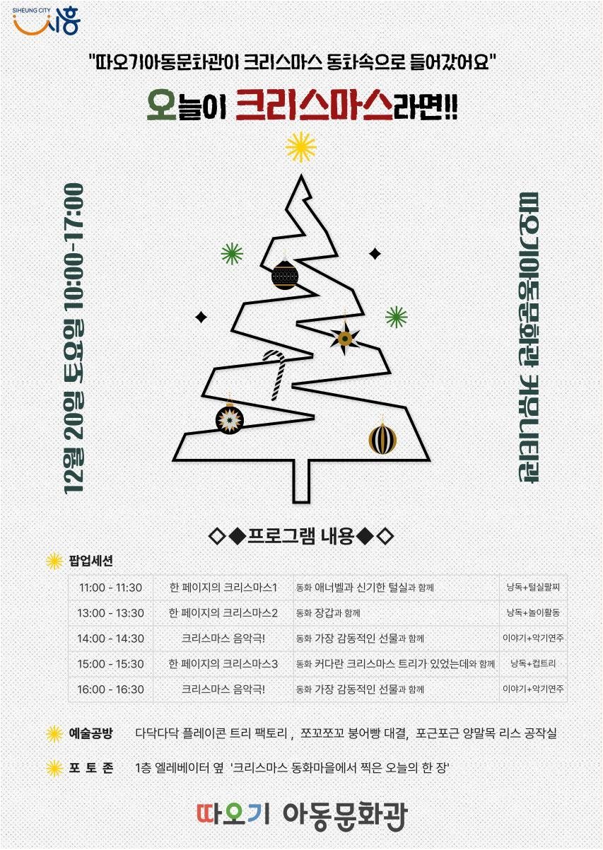 [금요저널] 시흥시 따오기아동문화관이 오는 12월 20일 크리스마스 문화행사 ‘오늘이 크리스마스라면’을 연다. 반짝이는 트리, 서늘한 겨울 공기, 책장을 넘기는 소리가 한데 어우러지며 문화관은 잠시 ‘이야기가 살아 움직이는 공간’으로 변한다.