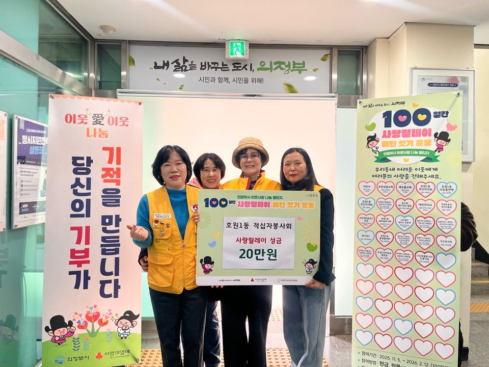 [금요저널] 의정부시 호원1동주민센터는 12월 11일 호원1동 적십자봉사회가 성금 20만 원을 기부하며 ‘100일간 사랑릴레이 배턴 잇기’에 동참했다고 밝혔다.