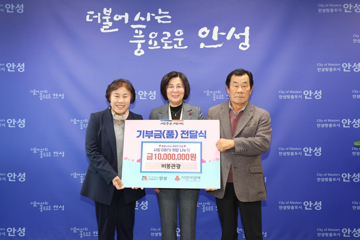 [금요저널] 안성시는 지난 12월 15일 비봉관광여행사로부터 개업 30주년을 맞아 지역사회에 감사의 뜻을 전하는 기부금 1천만원을 전달받았다고 밝혔다.