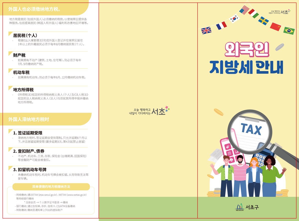 [금요저널] 서울 서초구는 지역 내 거주하는 외국인 주민들의 지방세 납부 편의를 위해 총 4개 언어로 제작한 ‘외국인 지방세 안내’리플렛을 제작해 배부에 나선다고 밝혔다.