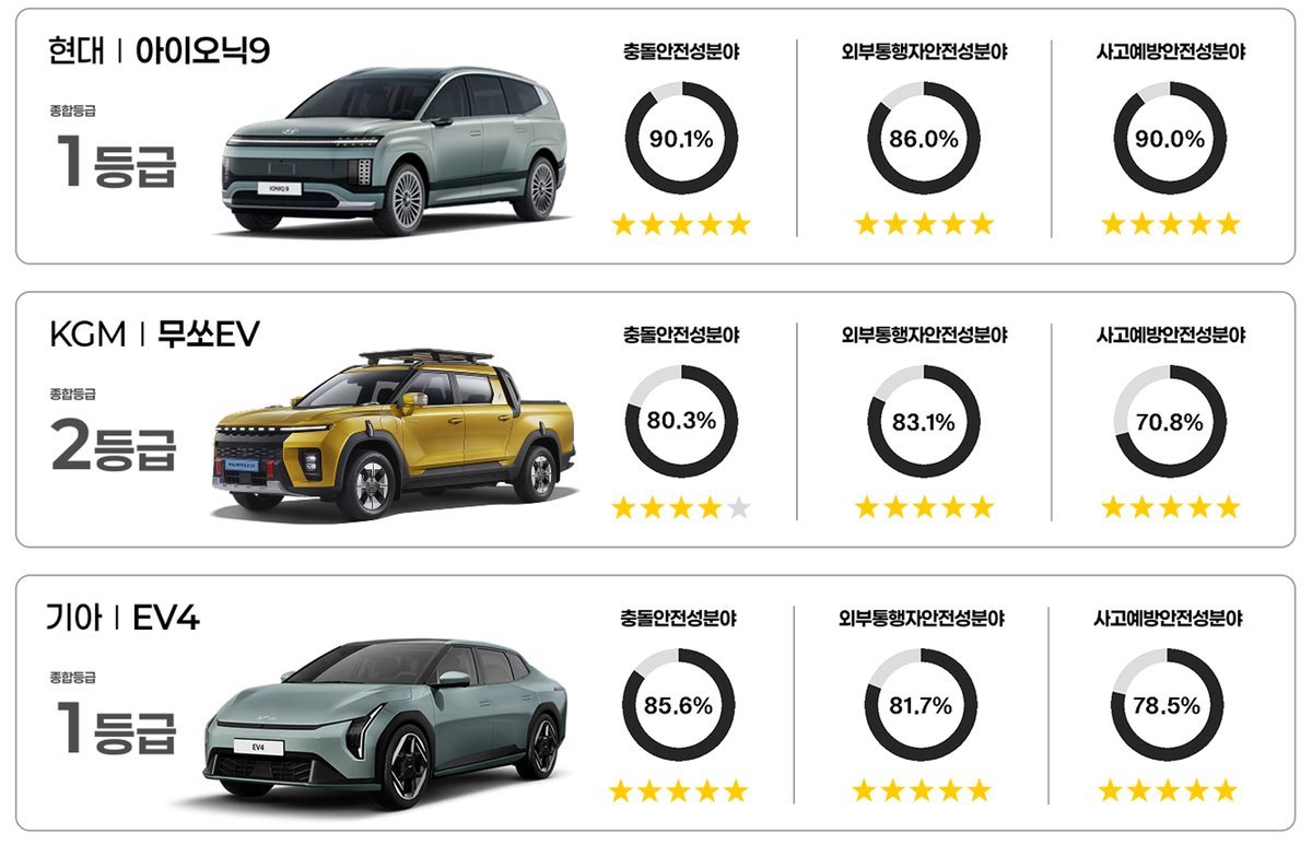 현대 아이오닉9, 팰리세이드, 넥쏘, 기아 EV4 등 4개 차종은 3개 평가 분야에서 모두 높은 점수를 얻어 1등급을 획득하였다.