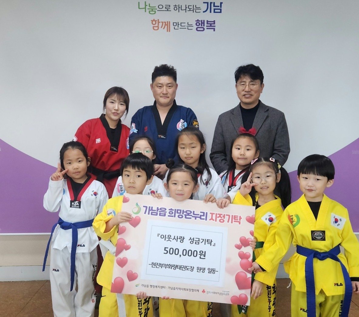 [금요저널] 가남읍행정복지센터은 지난 12일, 현진부부화랑태권도장에서 원생들과 학부모, 관장의 따뜻한 마음을 모아 이웃돕기 성금 50만 원을 기탁했다고 밝혔다.