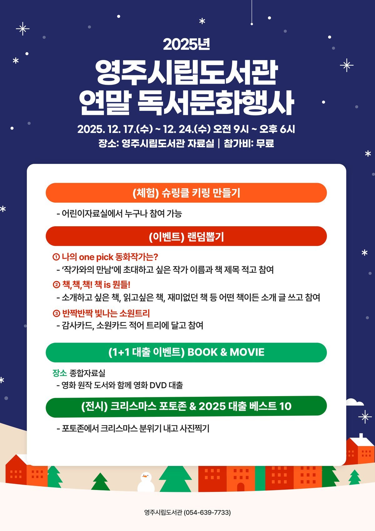[금요저널] 영주시립도서관, 연말맞이 독서문화행사 운영 책과 함께 한 해 마무리하기 영주시립도서관은 연말을 맞아 12월 17일부터 24일까지 7일간 겨울 감성과 크리스마스 분위기를 느낄 수 있는 연말맞이 독서문화행사를 운영한다.