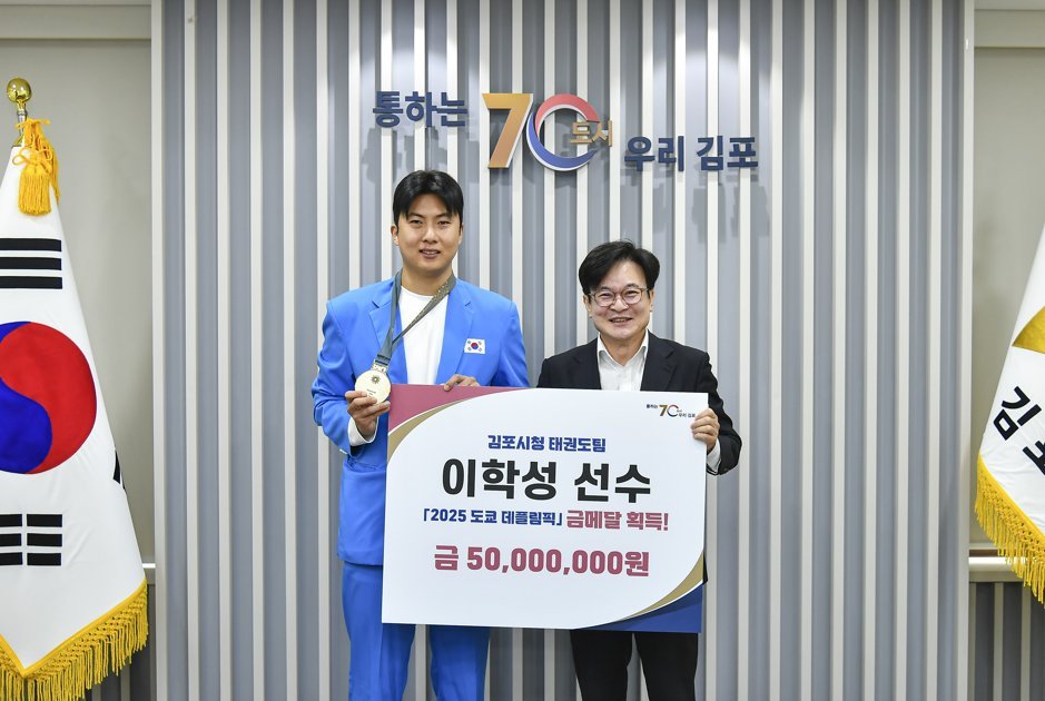 [금요저널] 김포시는 17일 김포시청 소통실에서 2025 도쿄 데플림픽 태권도 +80kg급 금메달을 획득한 이학성 선수에게 포상금을 수여하며 그간의 노고를 격려했다. 이날 수여식에는 김병수 김포시장을 비롯해 교육문화국장, 체육과장, 지도자가 참석했으며 이학성 선수에게는 입상 포상금 5,000만원이 수여됐다.