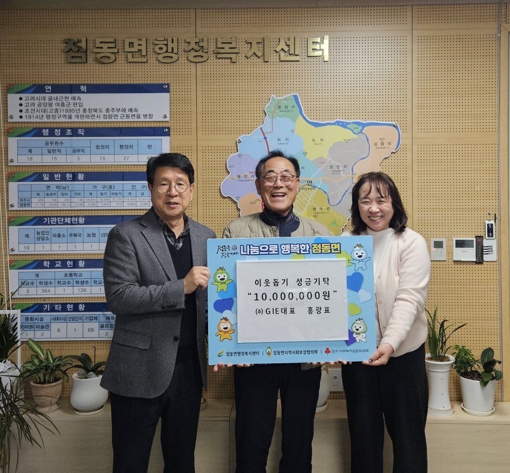 [금요저널] 점동면은 GIE 대표 홍광표가 2025년 한 해 동안 점동면에 총 3000만원의 기부금을 기탁하며, 지역사회 발전과 취약계층 지원을 위한 꾸준한 나눔을 실천하고 있다고 밝혔다.