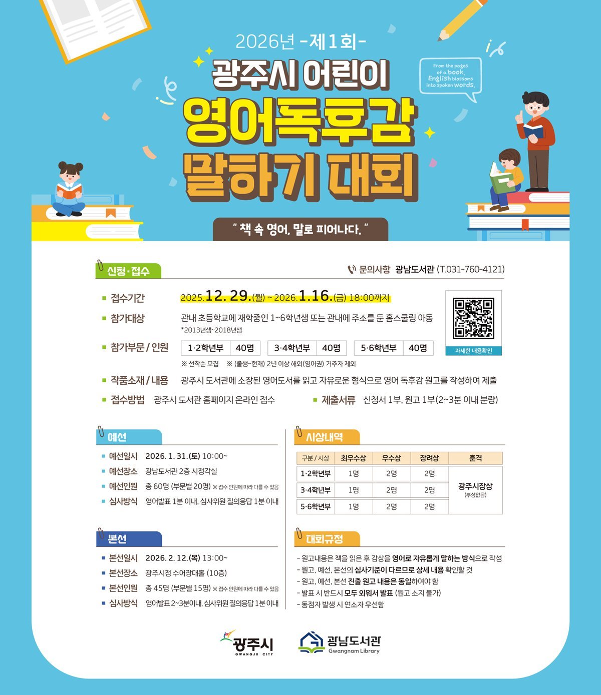 참가 대상은 광주시 지역 내 초등학교 재학생 1~6학년 또는 광주시 거주 홈스쿨링 아동이며, 출생부터 현재까지 영어권 국가에 2년 이상 거주한 아동은 참가가 제한된다.