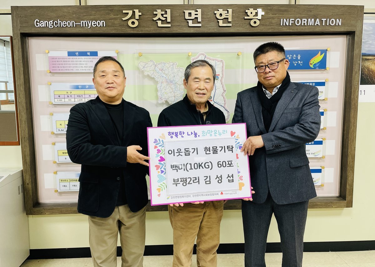 배인수 강천면장은 “모두가 어려운 시기임에도 불구하고 매년 변함없는 이웃사랑을 실천해 주시는 김성섭 님께 진심으로 감사드린다”며 “기탁해 주신 소중한 쌀은 기부자의 따뜻한 마음을 담아 관내 복지 사각지대 및 소외계층에게 정성껏 전달하겠다”고 말했다.