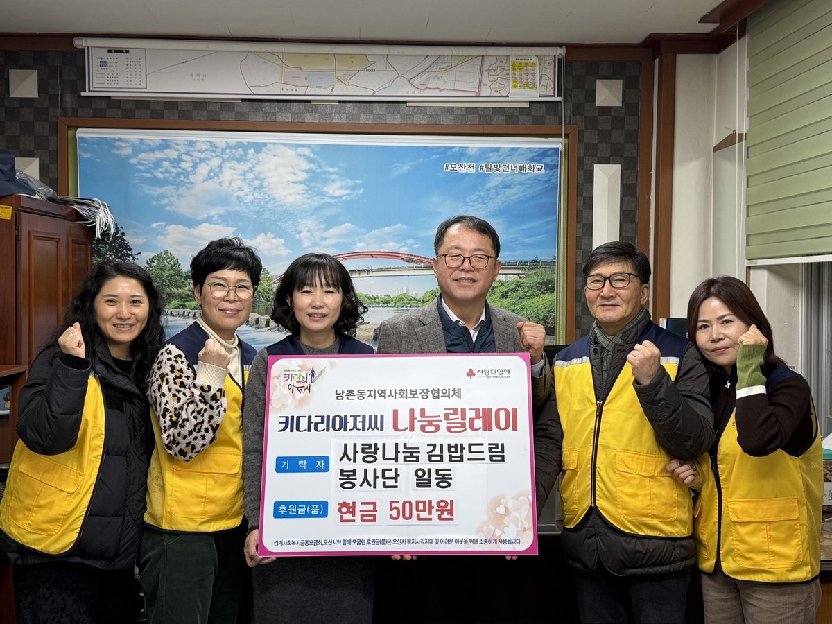 [금요저널] 오산시 남촌동 행정복지센터는 지난 18일 ‘사랑나눔 김밥드림 봉사단’이 연말을 맞아 지역 내 어려운 이웃을 돕기 위해 성금 50만 원을 기탁했다고 밝혔다.
