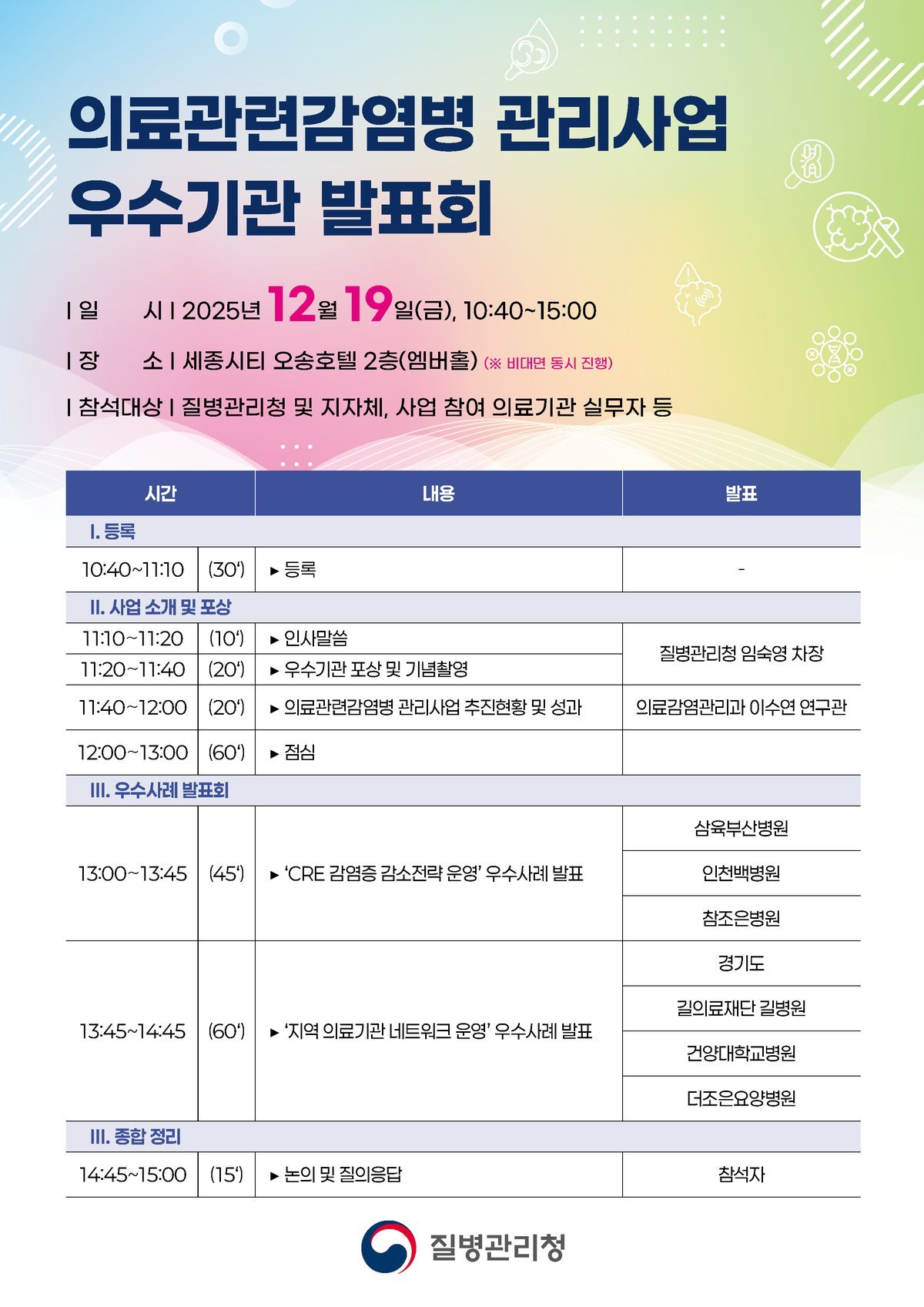 [금요저널] 질병관리청은 12월 19일 11시 오송호텔에서 「2025년 의료관련감염병 관리사업 발표회」를 개최하고, 한 해 동안 의료관련감염병 예방 및 관리에 기여한 우수기관을 포상한다.