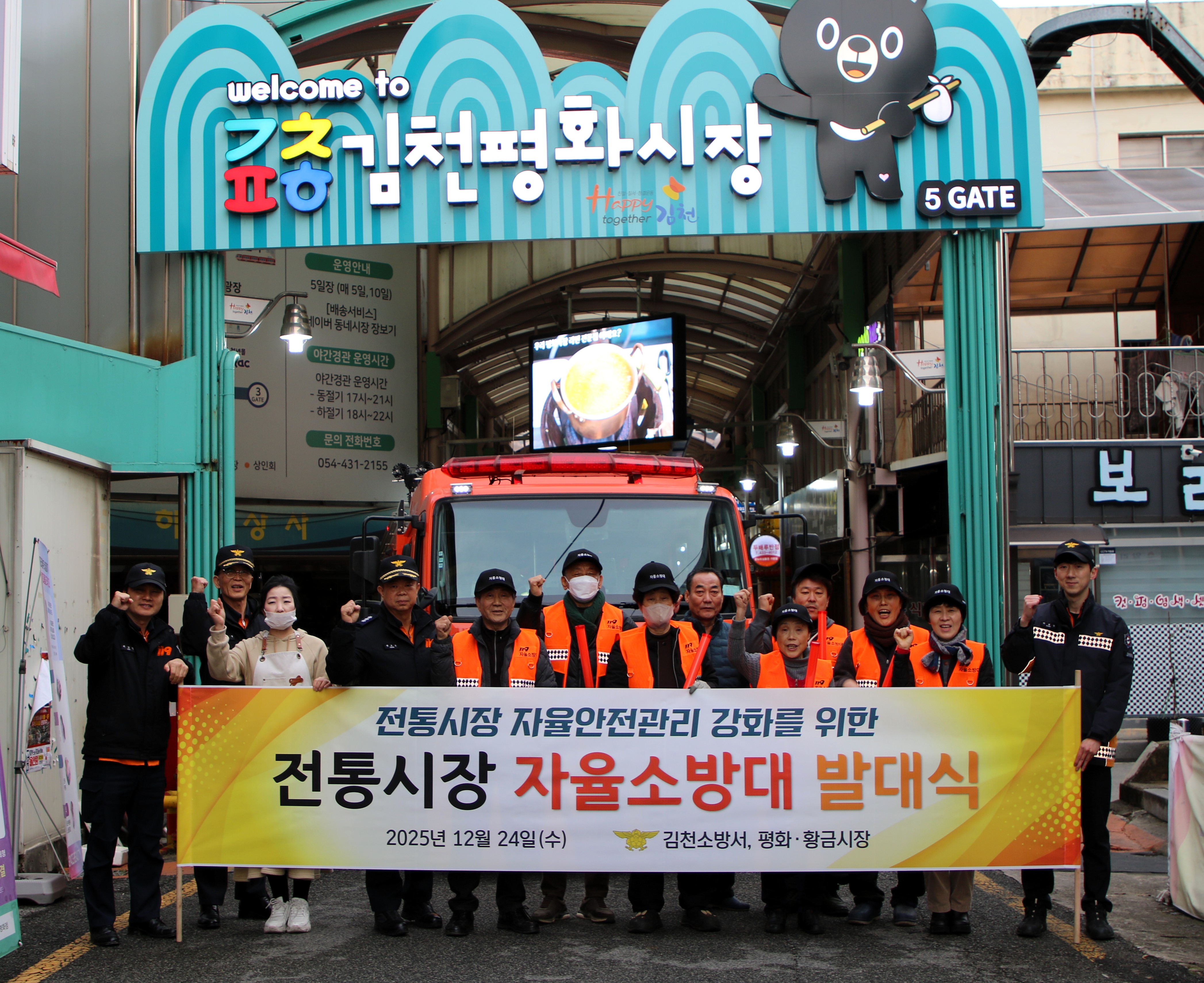 김천소방서(서장 송영환)는 24일, 김천시 평화시장에서 '전통시장 자율소방대 발대식'을 개최하고 전통시장 화재 예방 및 초기 대응 역량 강화에 나섰다.