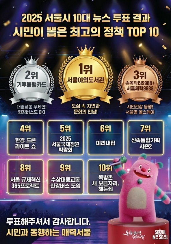 ‘2025 서울시 10대 뉴스 투표 결과’는 네이버, 다음 등 포털사이트에서 ‘서울’, ‘서울시 10대 뉴스’를 검색하거나 서울시 누리집에서 확인할 수 있다.