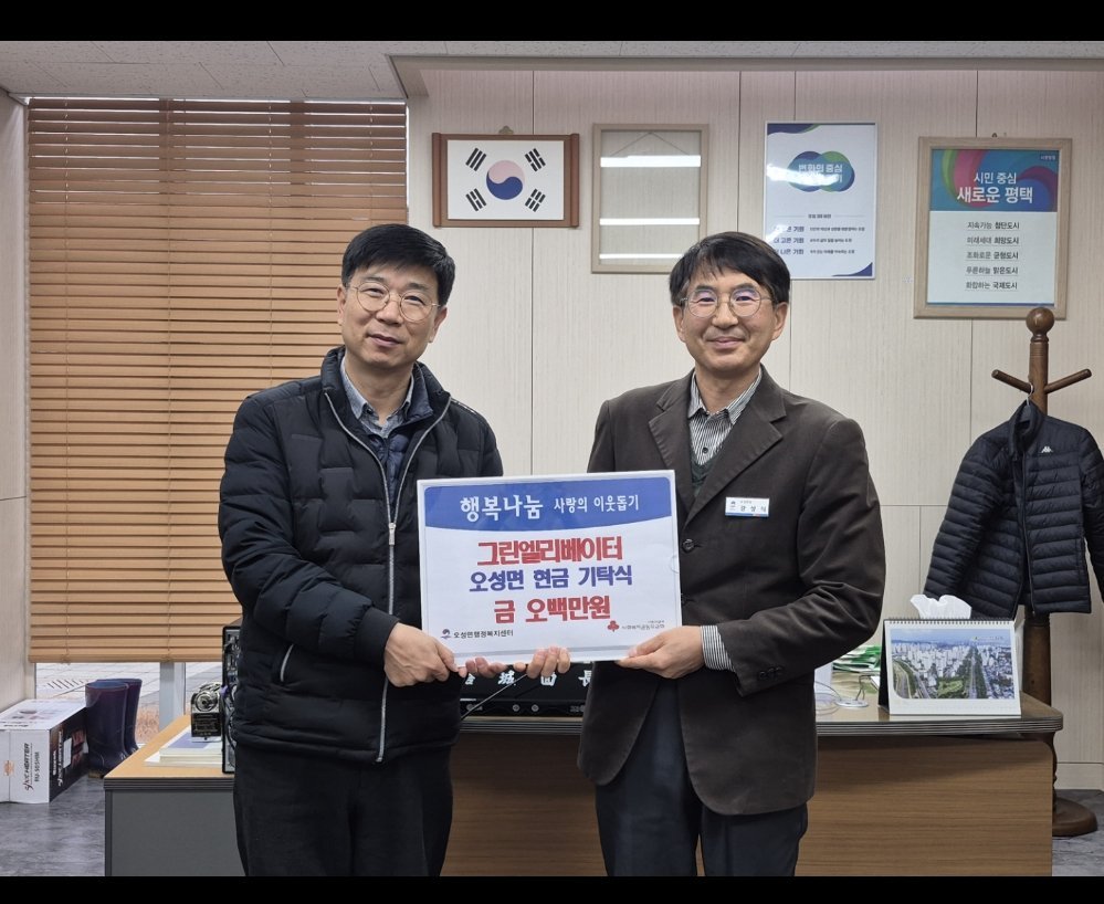강성식 오성면장은 “어려운 경기 여건 속에서도 이웃을 위한 나눔에 앞장서 신 그린엘리베이터에 깊이 감사드린다”며 “기부자의 소중한 마음이 도움이 필요한 분들께 잘 전달될 수 있도록 하겠다”고 말했다.
