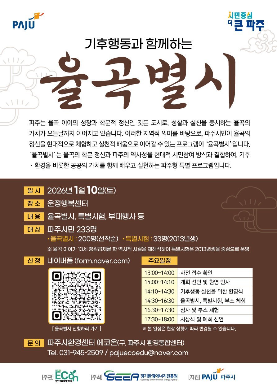 [금요저널] 파주시환경센터 ‘에코온’은 파주를 대표하는 조선시대 사상가 율곡 이이의 학문 정신을 현대적 기후행동 가치로 재해석한 기후문화축제 ‘기후행동과 함께하는 율곡별시’를 오는 내년 1월 10일 운정행복센터에서 개최한다.